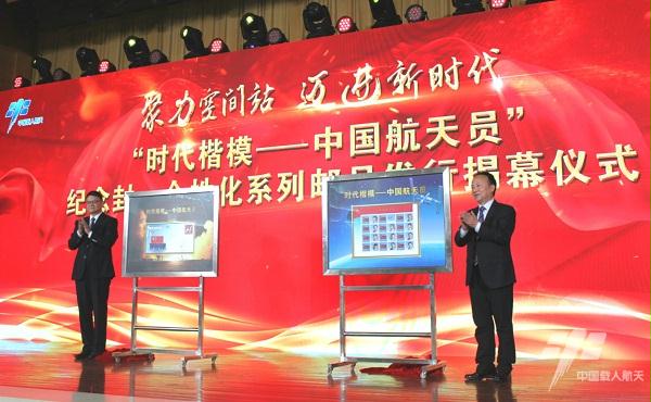 2018年1月25日,中央宣传部向全社会公开发布航天员群体的先进事迹,授予他们“时代楷模”荣誉称号,引起社会各界强烈反响。为引导激励广大干部群众特别是青年学生和部队官兵,从航天员群体的先进事迹中汲取精神力量,满怀豪情地投身强国强军实践,中国集邮总公司制作发行了“时代楷模——中国航天员”个性化邮品。活动中,中国航天员科研训练中心与中国集邮总公司领导为邮品揭幕。