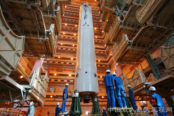 图7:7月27日工作人员对长二F火箭进行吊装(汪江波 摄)
