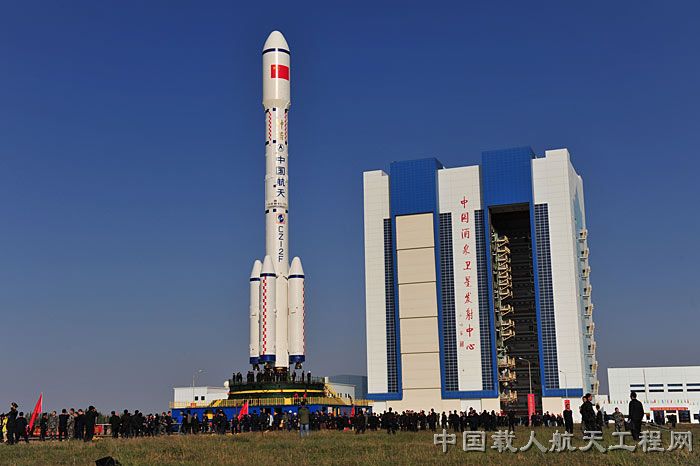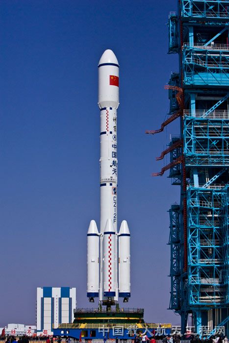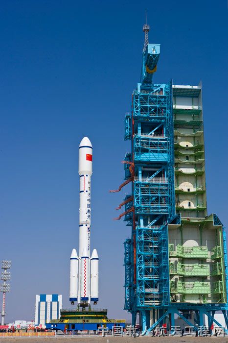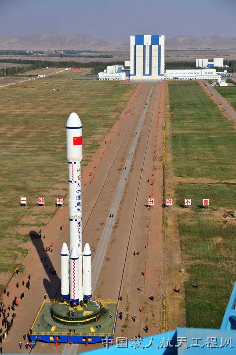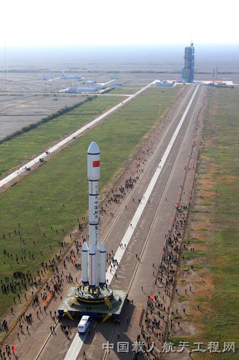 图8:转运到发射塔架下的器箭组合体(李玉建 摄)