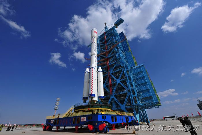 图7:天宫一号与火箭联合体转运至发射塔架后的雄姿。(武向荣 摄)