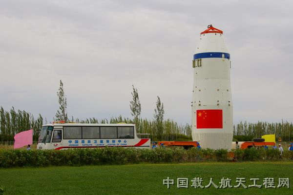 2008年8月28日神舟七号载人飞船转往垂直总装测试厂房,准备和长征-2f运载火箭进行组装。图为飞船转运途中