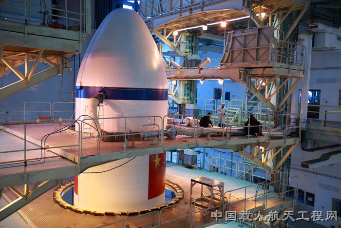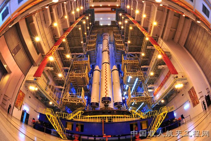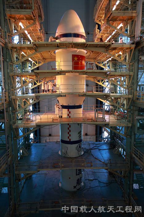 图5:天宫一号与火箭对接后在垂直总装测试厂房中的英姿。(武向荣 摄)