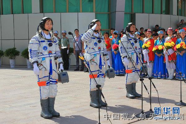 图3:6月16日,神舟九号航天员出征仪式在酒泉卫星发射中心航天员公寓问天阁举行。(王建民 摄)