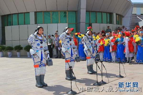 图5:6月16日,神舟九号航天员出征仪式在酒泉卫星发射中心航天员公寓问天阁举行。(王建民 摄)