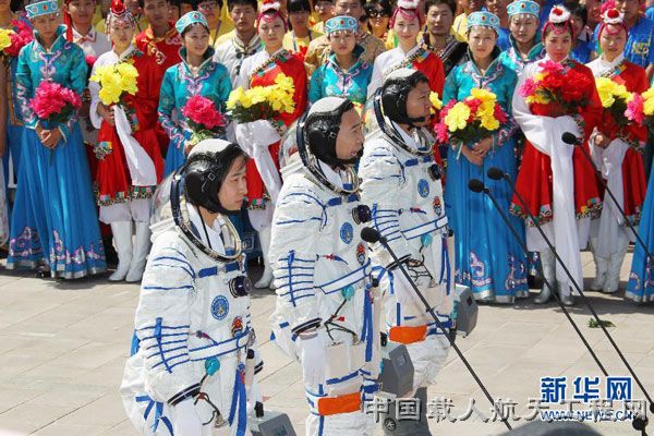 图1:6月16日,神舟九号航天员出征仪式在酒泉卫星发射中心航天员公寓问天阁举行。(李刚 摄)
