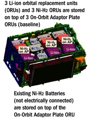 波音公司作为国际空间站的主承包商,被授予2.088亿美元合同,提供27组锂离子电池,其中24组作为国际空间站替换电池单元,3组作为地面备份使用。每组电池重425磅,尺寸为39英寸×39英寸×18英寸。这些电池利用空间站上的太阳能阵列在有阳光时充电,在没有阳光时放电提供能量。