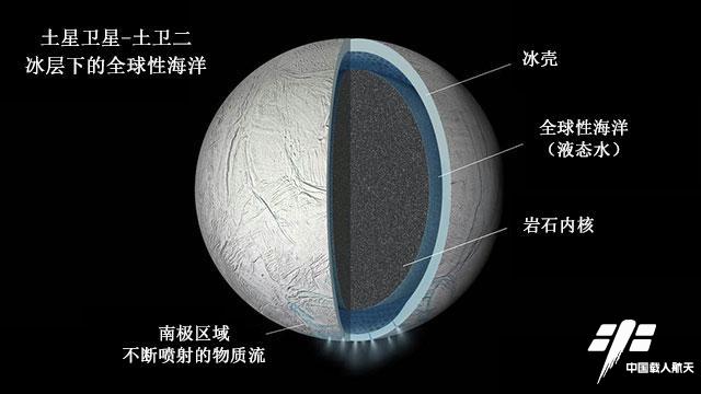 图1:土卫二冰壳与岩石核心之间是一层由水组成的全球性海洋,海底有地热产生的热泉。(图片来源:腾讯网)