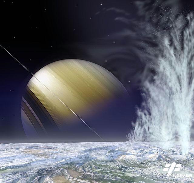 图3:土卫二南极表面艺术效果图,背景是土星与土星环,右侧为不断喷射的热泉。(图片来源:腾讯网)