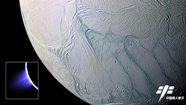 图2:小图为“卡西尼”号拍摄的土卫二南极热泉喷射出的羽状物,大图为土卫二南极附近“虎皮条纹”地形。(图片来源:腾讯网)