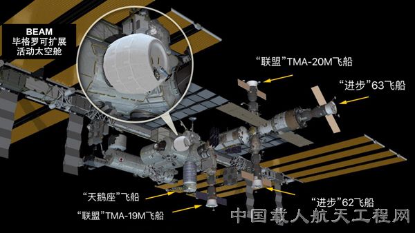 BEAM于4月10日搭乘SpaceX的“龙”货运飞船抵达国际空间站,并于4月16日由“加拿大”-2机械臂安装至“宁静”号节点舱尾部的装配端口旁。