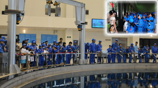实地参观航天员地面训练设备设施,如:神舟飞船全仿真模拟器、离心机、转椅、冲击塔、低压试验舱、模拟失重水槽......