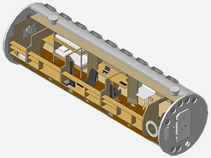 着陆舱(EU-50)结构图着陆舱 容积为50立方米,是模拟火星着陆器的舱段,3名成员将在该模拟舱中停留2~3个月。它包括: ——可以居住3人的生活区,还有工作区; ——厨房; ——卫生间; ——2个转换通道,可以通往生活舱和火星表面模拟器舱的封闭室; ——生命保障系统。