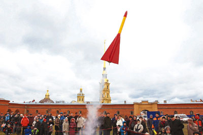 在圣彼得堡的彼得和帕维尔堡前,观众在观看形状为胡萝卜的自制火箭。