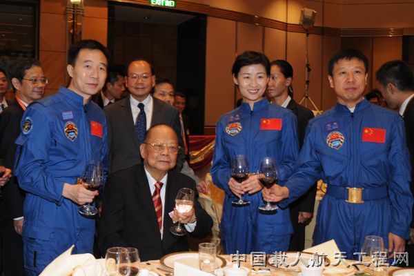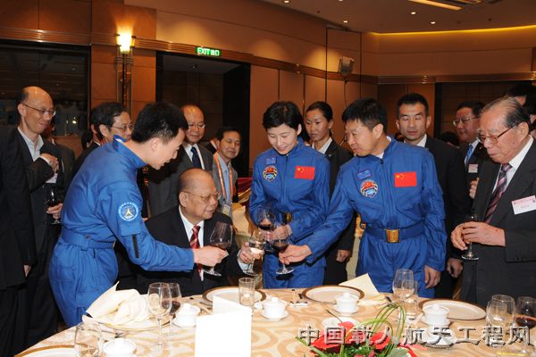 图:欢迎晚宴上三位航天员向曾宪梓先生敬酒(刘爽 摄)