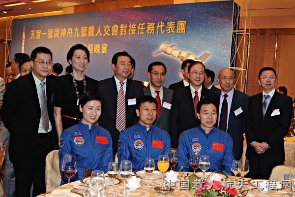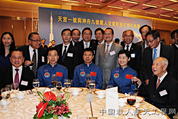 图:欢迎晚宴上香港各界人士争相与航天员合影留念(刘爽 摄)