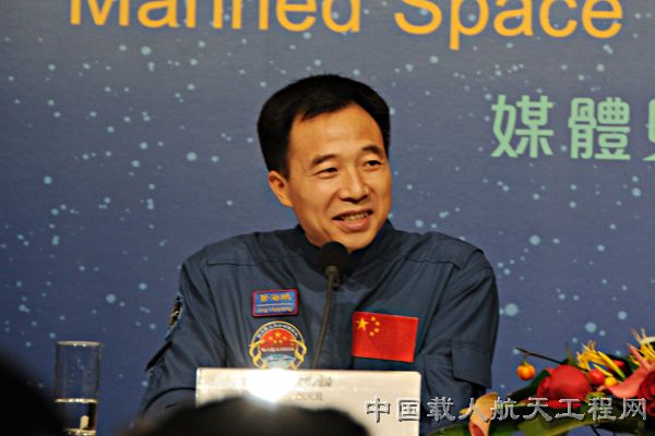 图:景海鹏反问向他提问的媒体记者太空中为何眼泪流不出来(刘爽 摄)